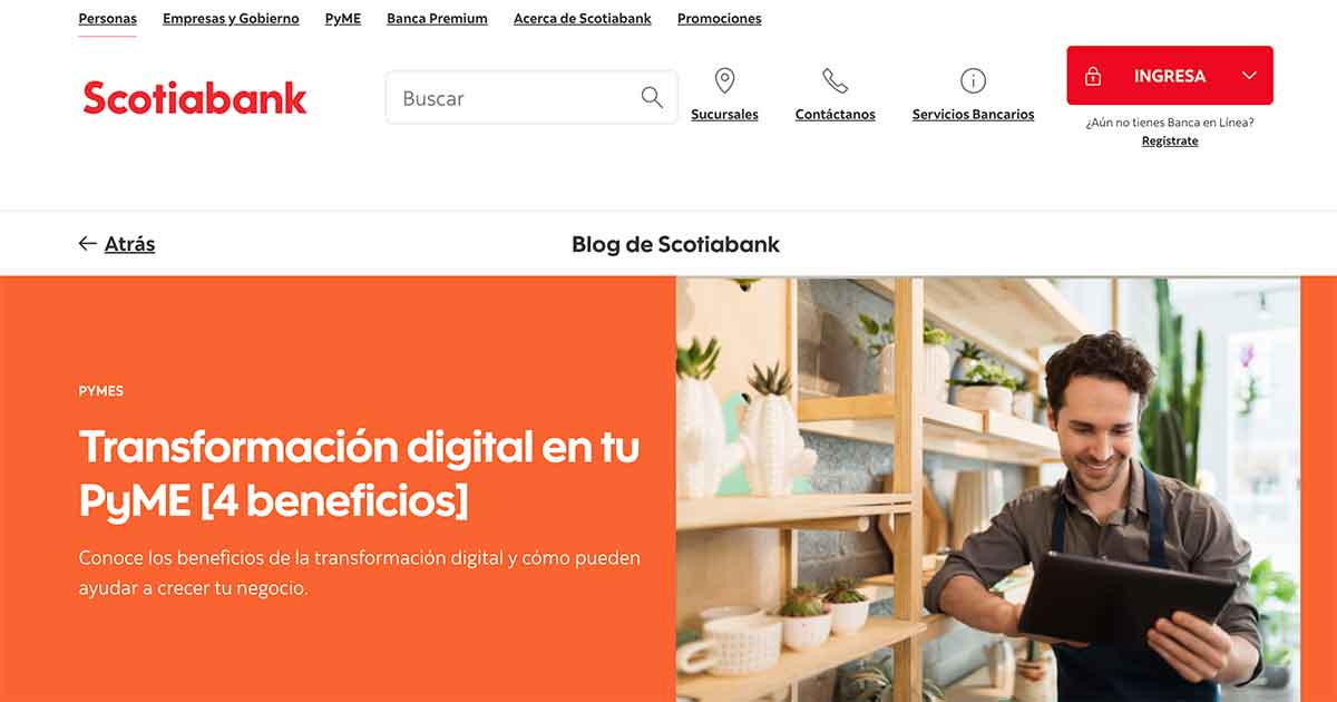 Un ejemplo de marketing de contenidos es el blog de Scotiabank. El banco desarrolla contenidos sobre finanzas enfocándose en clientes potenciales PyME. Sus contenidos suelen aparecer en Google cuando la gente busca resolver dudas financieras, haciendo que visiten el sitio donde obtienen respuestas y si así lo desean, contratar algún servicio o incluso recomendar el blog.