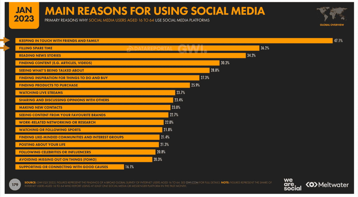 Estadísticamente, las 2 razones principales de la gente para estar en social media son: estar en contacto con familiares y amistades y pasar el tiempo.