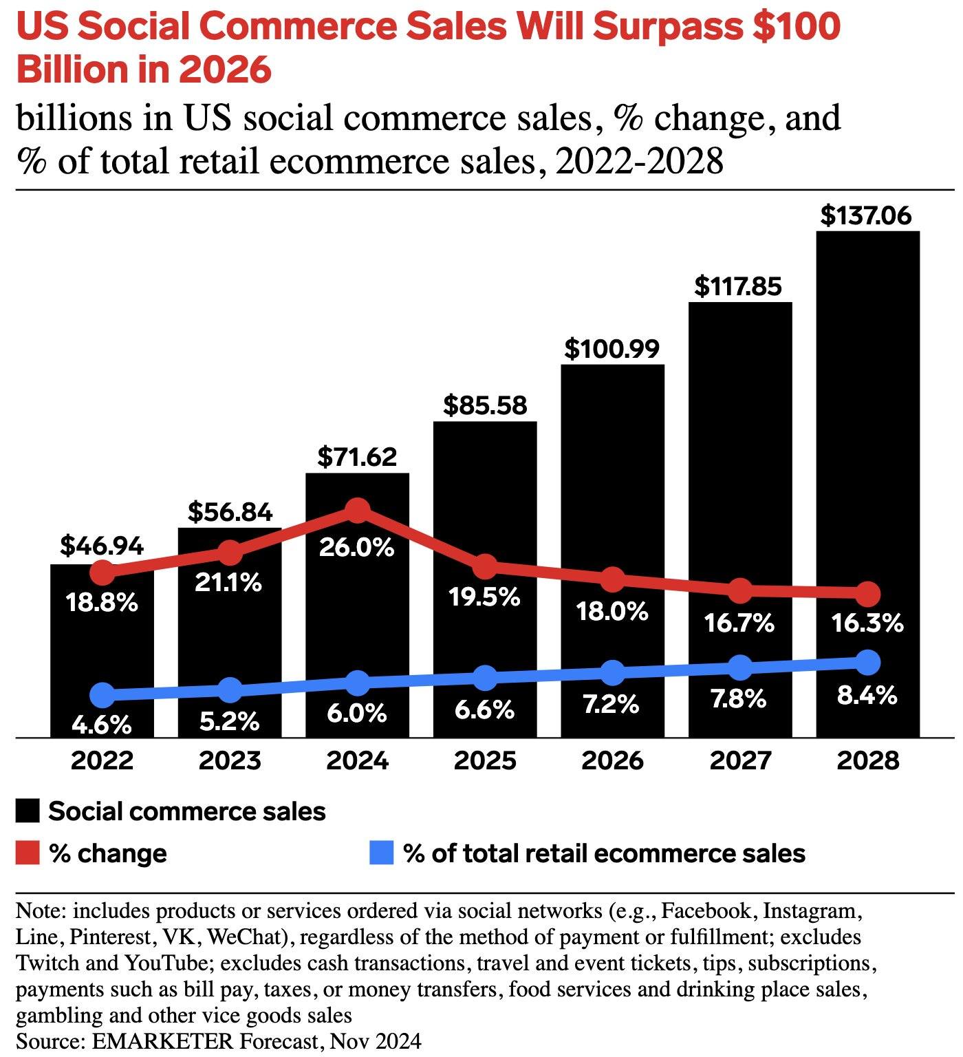 Para 2026, el social shopping en Estados Unidos superará los 100 mil millones de dólares. Y sí, el Marketing de Influencers en 2026 será protagonista en este fenómeno, especialmente en plataformas como TikTok, Instagram y YouTube.
