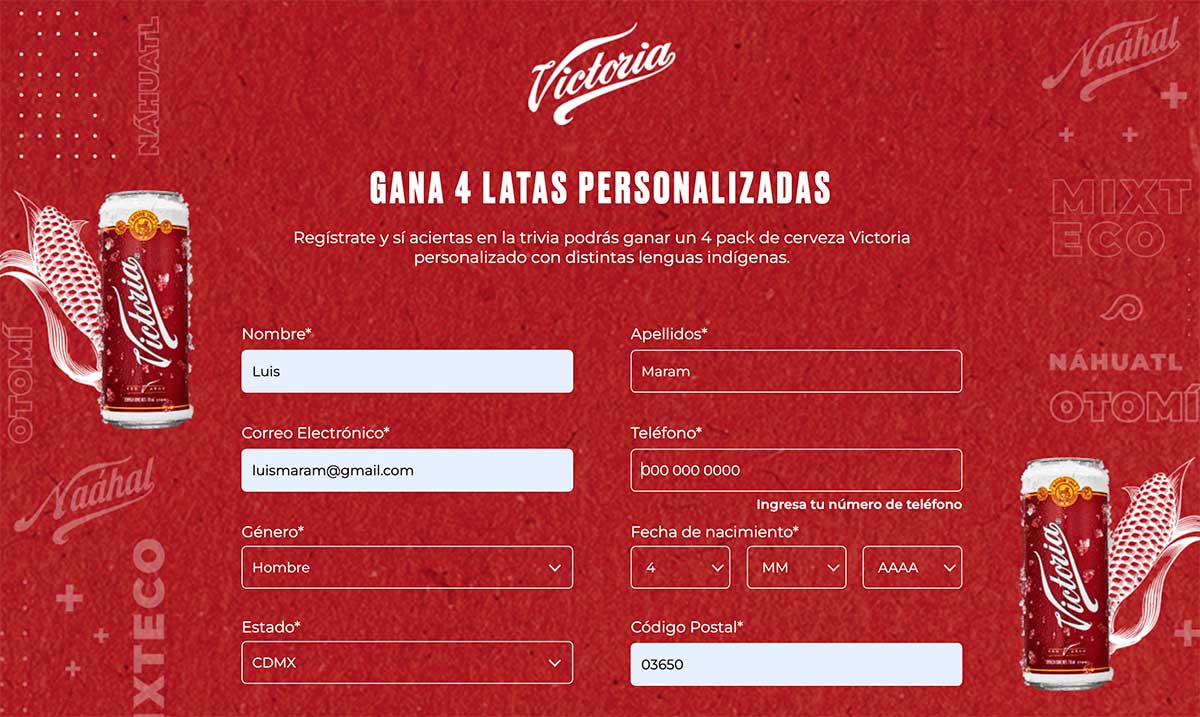 Para conseguir las latas edición especial ‘Lenguas Vivas’, se debe ingresar al sitio https://lenguasvivas.cervezavictoria.com.mx y registrarse para participar en una trivia… lo que constituye además un movimiento brillante de marketing online porque la marca conforma y/o acrecienta así su base de datos de personas directamente interesadas en ella.