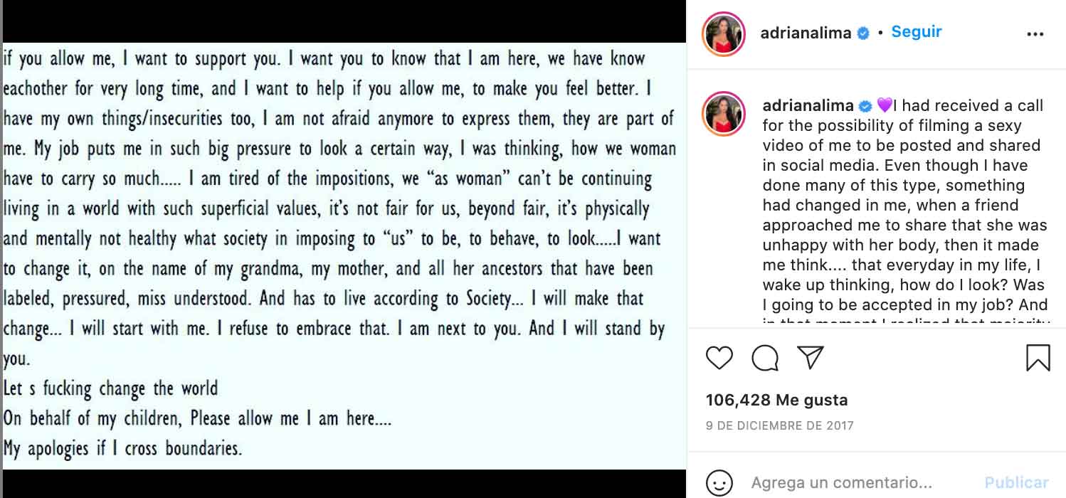 «Recibí una llamada con la propuesta de grabarme en un video sexy para publicarlo y compartirlo en las redes sociales. Aunque he hecho muchas cosas de este tipo, algo cambió en mí, cuando una amiga se me acercó para decirme que no estaba contenta con su cuerpo. Luego me hizo pensar … Todos los días en mi vida me levanto pensando, ¿cómo me veo? ¿Seré aceptada en mi trabajo? Y en ese momento me di cuenta de que la mayoría de las mujeres probablemente se despiertan todas las mañanas tratando de encajar en un estereotipo que la sociedad/medios sociales/moda etc. imponen… Pensé que no era una forma de vivir, y más allá de eso… eso no es física ni mentalmente saludable, así que decidí hacer ese cambio … No volveré a quitarme la ropa por una causa vacía…»