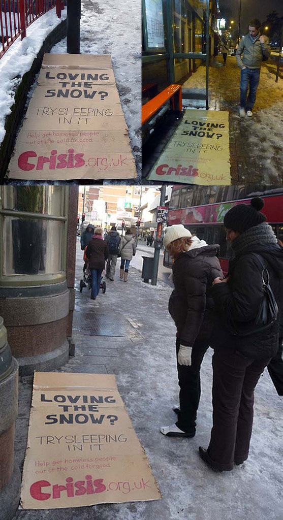 De eso se trata esta guerrilla de marketing social, hecha con simples cartones corrugados colocados estratégicamente por la ciudad para Crisis, organización británica para la protección de las personas sin hogar. Dicha institución se avoca a proporcionar opciones innovadoras de educación, empleo y bienestar para evitar el crecimiento estadístico de personas sin techo.