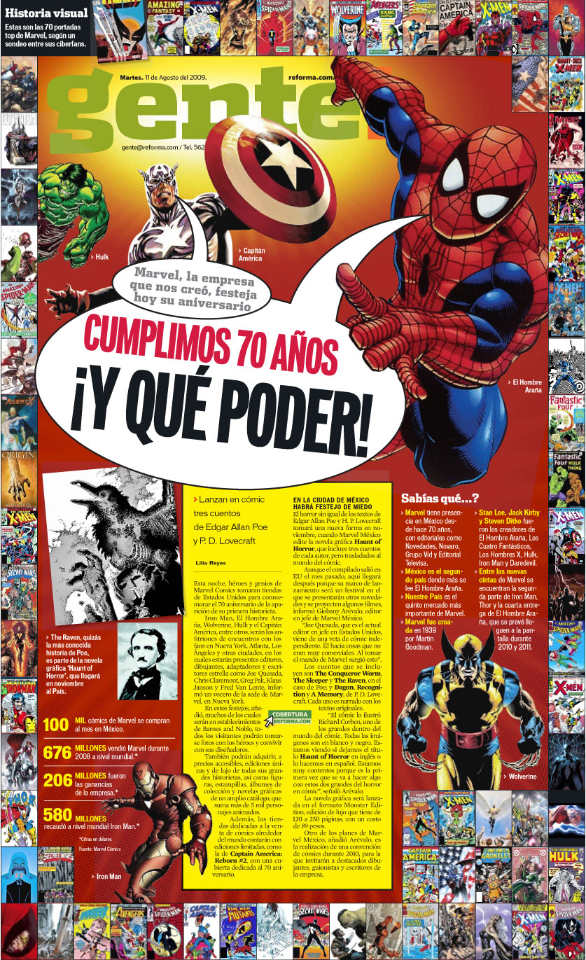 Hoy 11 de agosto, la casa cumplió 70 años y el diario Reforma en México le dedicó la primera plana de su sección de espectáculos, mostrando un reportaje y las 70 portadas top seleccionadas por los fans de Marvel. Aquí se las compartimos.