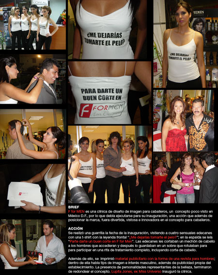 Una auténtica tomada de pelo. Guerrilla para F for Men, una clí­nica de imagen para caballeros en México D.F. La acción consisitió en, el dí­a de la inauguración, vestir a cuatro sensuales chicas con una T-Shirt que llevaba en la parte frontal la leyenda «¿Me dejarí­as tomarte el pelo?«, mientras que en la posterior se leí­a «Para darte un buen corte en F for Men«.