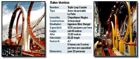 En esta lucha de muchas vueltas y diversión y, ante la llegada del Superman, la última gran atracción de Six Flags, La Feria ha decidido aumentar su portafolio de servicios y traer a México la Triple Loop Coaster, una montaña rusa de más de mil metros de recorrido, 33.83 metros de alto y una velocidad mayor a 85 km/h. Sin embargo, lo más atractivo de este nuevo monstruo metálico, son sus tres giros en 360º, algo nunca antes visto en nuestro paí­s.