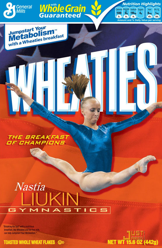 Nastia Liukin, la estrella de la gimnasia norteamericana de legales 18 años, es la nueva imagen del cereal Wheaties. No es un gran diseño de empaque pero es un gran marketing. ¿Cuántas niñas amantes de la gimnasia no comprarán esta caja?