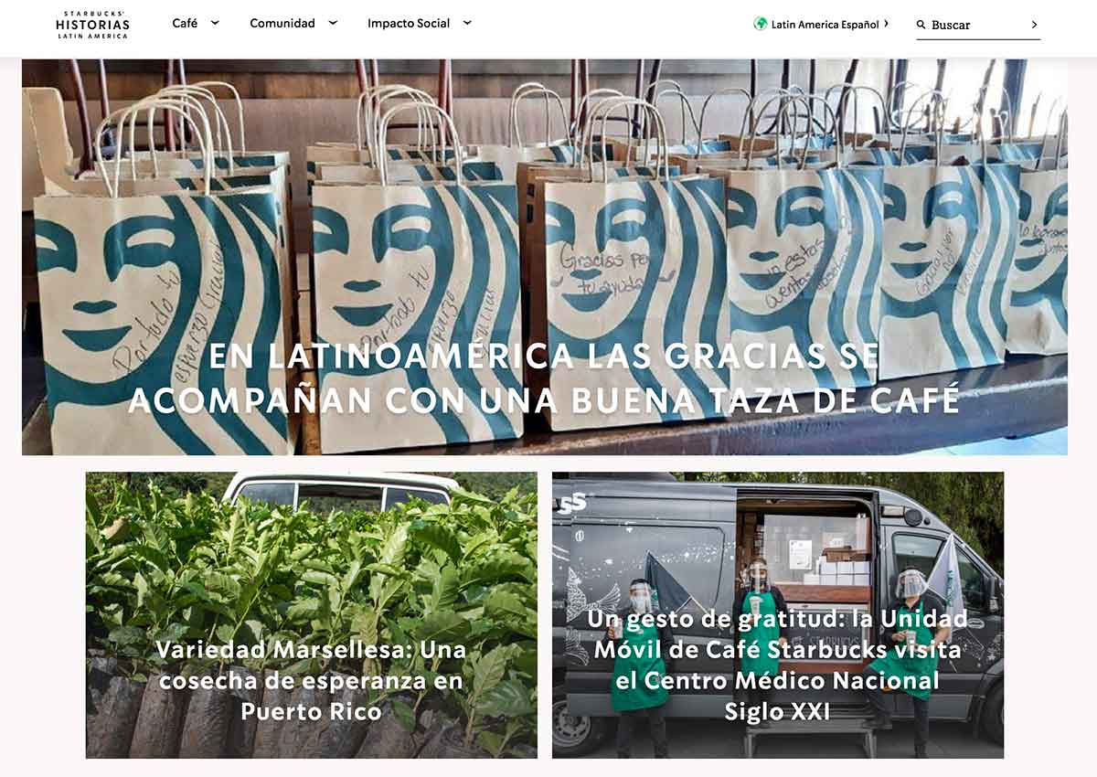 Un buen ejemplo es el blog de Starbucks para Latinoamérica denominado Historias Starbucks. En él hablan de sostenibilidad, apoyo a caficultores, impacto ambiental, prácticas de comercio justo, entre otros contenidos.