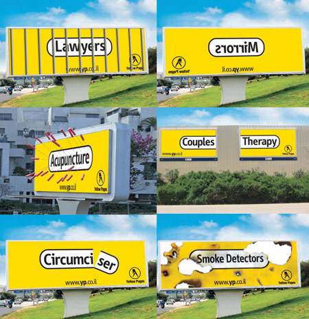 No es común ya sorprendernos con outdoors, a menos que se combinan con formas de guerrilla. Sin embargo, esta campaña para Yellow Pages de Israel (Sección Amarilla en México) es creativa hasta decir basta, utilizando simplemente la conceptualización de las palabras, colores brillantes, tipografía…y mucho cerebro. Brillante.