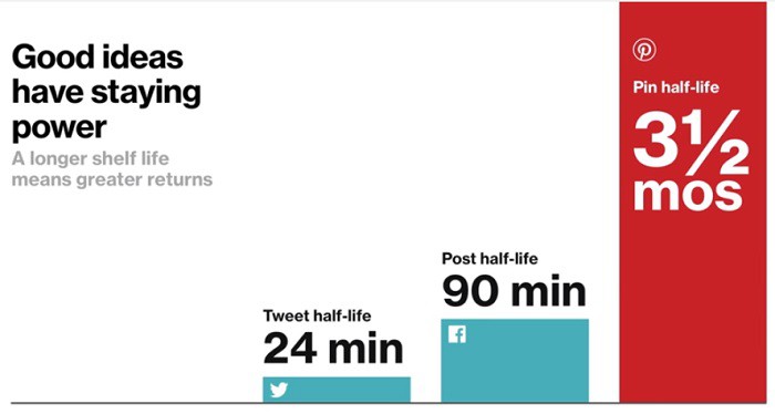 La vida de una publicación en Facebook y Twitter es muy corta. Pero en Pinterest 80% de los pines son repines y a un pin le toma 3.5 meses para obtener 50% del engagement.