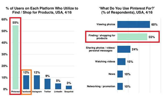 Mira esta estadística del reporte de Mary Meeker sobre las tendencias en internet en 2016: 55% de los pinners usan la plataforma para encontrar y comprar productos. Solo 12% en Facebook, 12% en Instagram, 9% en Twitter, 5% en LinkedIn y 3% en SnapChat.