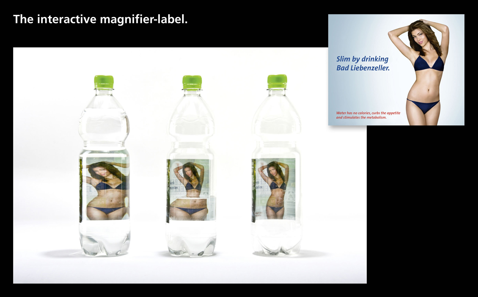 Se trata de una botella de agua donde el reverso de la etiqueta muestra a una mujer en bikini. Cuando la botella está llena, el agua distorsiona la imagen y la hace ver «gorda», sin embargo, cuando el usuario ha bebido el líquido, la imagen se muestra perfecta y esbelta. La connotación es obvia: los beneficios de beber este producto te hacen lucir así. Si hablamos de retórica diríamos que es una simple metonimia de causa-efecto.