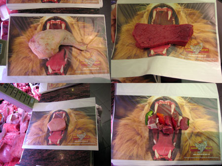¿Se atreverían a arrebatarle la carne a un león de sus mismas fauces?… uhm, no… ¡Cobardones! Seguro que no… A menos claro que se trate del ingenioso diseño de BTL para Safari Park Beekse Bergen, quienes para publicitar las visitas al zoológico, imprimieron este león en papeles encerados, —de esos que se utilizan para envolver carne— mismos que repartieron en carnicerías para que en ellos se entregaran los pedidos.