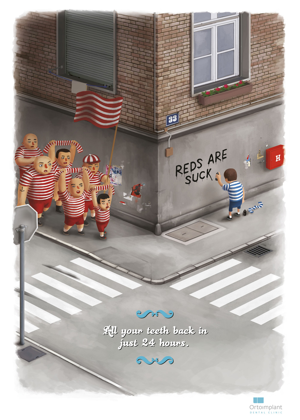 Como ejemplo tenemos esta espléndida ilustración que no requiere explicación… todos sabemos lo que le va a suceder al pobre individuo que está pintando la pared. Tomando en cuenta lo anterior, el copy de Ortoimplant es muy divertido, a la vez que transmite de forma correcta y persusasiva el mensaje del servicio: Todos tus dientes de vuelta en tan sólo 24 horas.