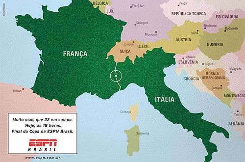 Creo que ésta es una de las muestras más contundentes de cómo debe ser la verdadera publicidad: sencilla, clara, contundente, sorpresiva y funcional. Pocos ejemplos como éste. Una maravillosa metáfora que sustituye la burda geografía por la clásica cancha. Diseño de Copa del Mundo.