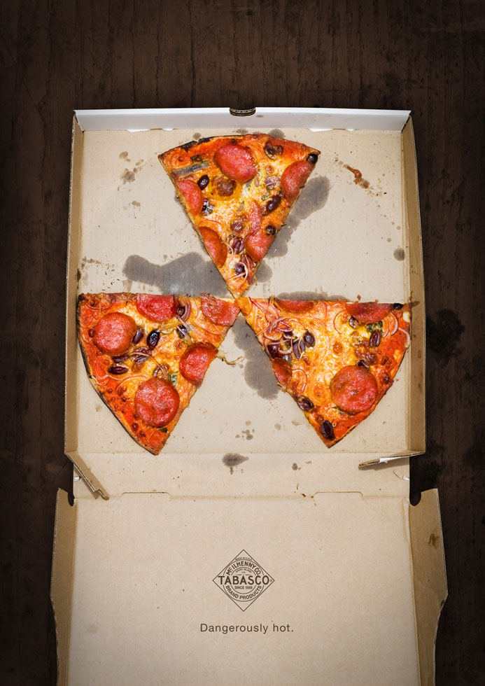 Es el caso de este sencillo anuncio estudiantil para la salsa Tabasco donde hay una simple relación entre el símbolo de radioactivo y el picante del producto.