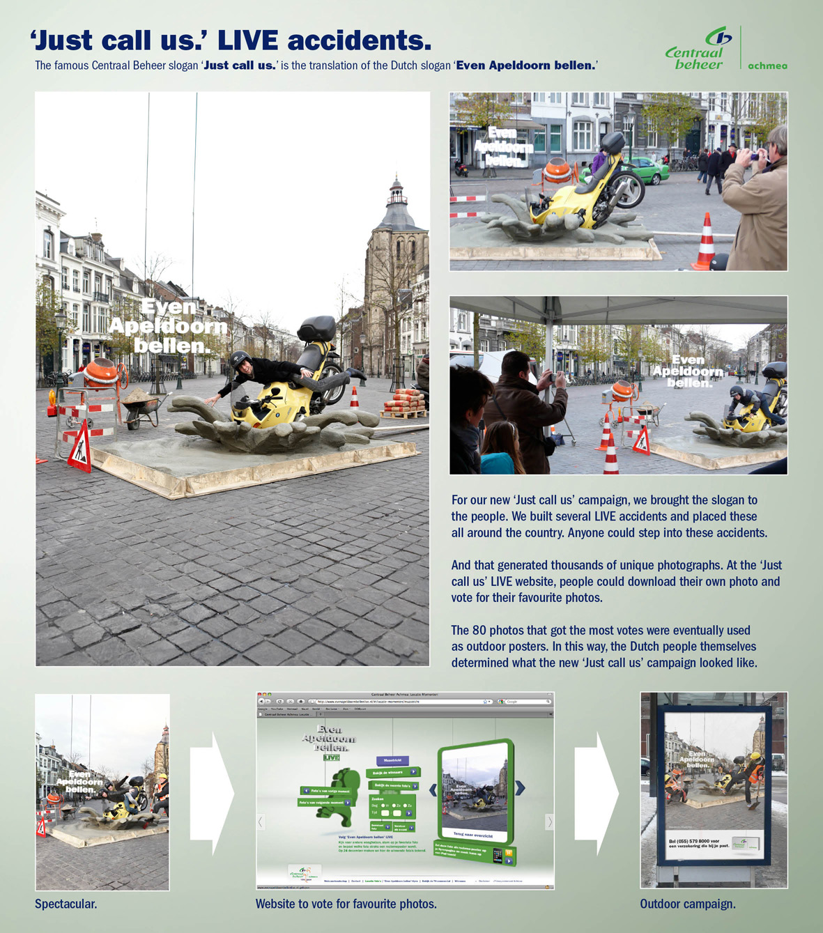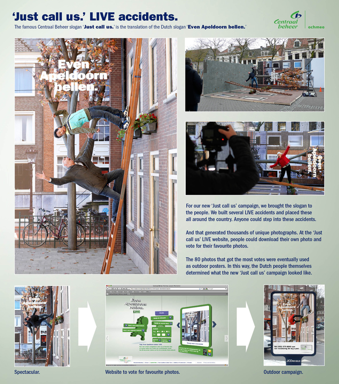 Las mejores campañas hoy en día son aquellas que logran integrar medios online con offline. Un buen ejemplo de ello lo realizó Central Beheer, una compañía de seguros holandesa que para su última campaña fabricó sets de accidentes (automóviles chocados, motocicletas incrustadas en monumentos públicos, entre otros); una vez listos, los colocó estratégicamente por la ciudad e invitó a la gente a fotografiarse en ellos, cosa que el público, en su siempre presente afán protagónico, hizo gustoso. Posteriormente se subieron las fotos a la web para que los participantes pudieran descargarlas y además se abrió una votación online para elegir las mejores. Las ganadoras se convirtieron así en los gráficos de la campaña publicitaria que posteriormente se exhibió en parabuses y espectaculares, con un texto que decía «Los accidentes suceden; llámanos.»