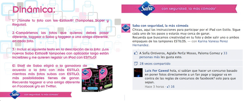 Uno de los fracasos más populares en este sentido fue el concurso lanzado por Saba un Día de la Mujer, en el que invitaban a sus consumidoras a tomarse una foto creativa con su producto. La foto más creativa a juicio del staff resultaría ganadora. Desde luego esto resultó en diversos comentarios desagradables en redes sociales, debido a la naturaleza íntima del producto, pero también violaba las normas de Facebook y ponía a la fanpage en riesgo de suspensión.
