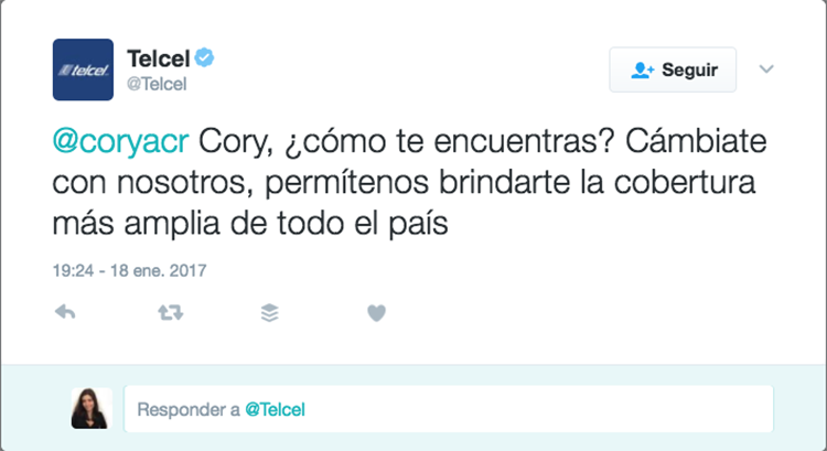 Convertirte en un gran espía no sirve de nada si no se aprovecha la información a tu favor. Mira este ejemplo de Telcel, que como resultado de su monitoreo pudo detectar uno de mis tuits sobre una mala experiencia de servicio con AT&T y me hizo llegar esta respuesta.