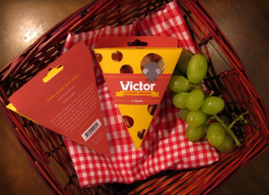 Para muestra, este diseño de empaque para ratoneras, obra de Kyle Hebert, en E.U…. Un empaque triangular, en forma de rebanada de queso; una completa ironía siendo que el queso es lo que usualmente colocamos en las ratoneras para atrapar roedores. La pieza aprovecha bien los agujeros típicos del lácteo para mostrar el producto; el diseñador hábilmente incorpora el ratón en uno de ellos y dentro de la marca, integrándolo en la «V» (que también es triangular) lo que aumenta la recordación; fíjese como la misma letra «V» con el ratón, vuelve a estar impresa en el producto. Como toque final, el diseño de la caja permite el embalaje modular, por lo que también funciona desde el punto de vista logístico, no importa si transporta en un diablito o en un contenedor. En resumen, es un diseño soberbio.