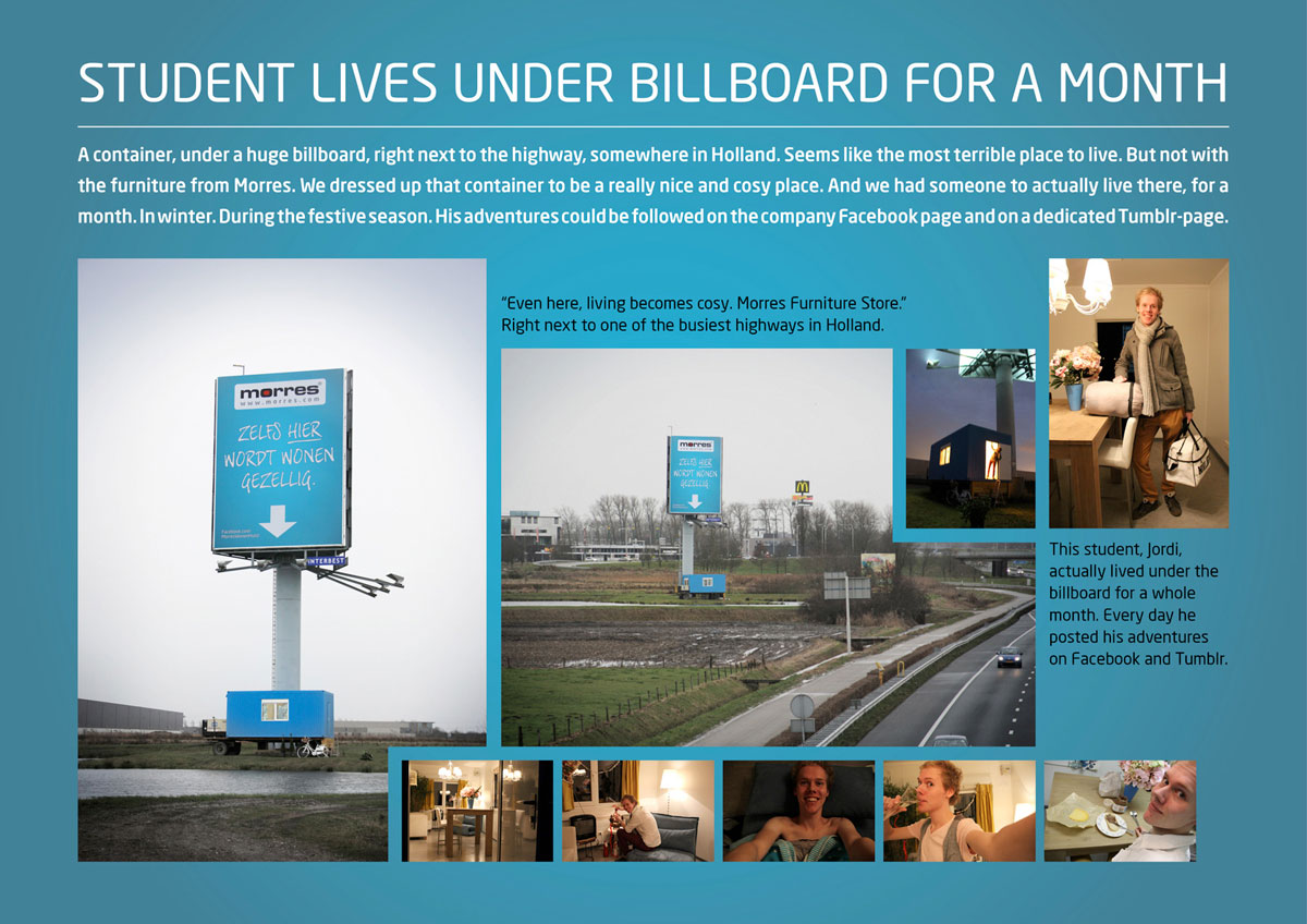 Una brillante mezcla de medios que apuestan por el word of mouse en las redes sociales con un experimento vivencial de un mes, respaldado por un anuncio outdoor ¿Cuánto se gastó la mueblería? Sólo pagó una cartelera bien situada, puso sus propios muebles y le dio la oportunidad a un joven de volverse «famoso». Puedo garantizar que fueron centavos a comparación de una pauta de publicidad tradicional que hubiera resultado innocua y aburrida.