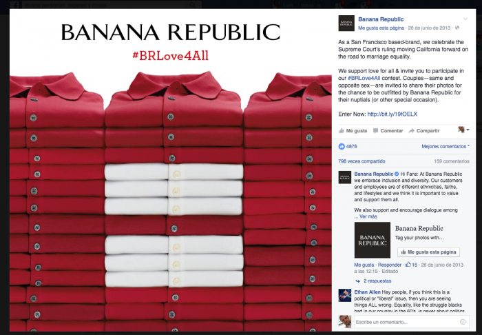Demorarse en un diseño complejo o en buscar demasiadas autorizaciones para ello puede hacernos perder el factor sorpresa. Para muestra este diseño de Banana Republic que celebró el día en que la Suprema Corte promoviera en California el matrimonio igualitario (la marca tiene sede en San Francisco); la imagen, que forma un signo de igual con las camisas, se usó para invitar a sus seguidores a postear sus fotos en Facebook usando el outfit de la marca que llevarían para su boda, ya fuera gay o heterosexual. Tan solo el post por sí mismo tuvo más de 4 mil likes, casi 800 shares y 160 comentarios. El diseño se viralizó por igual en otras redes como Instagram y Twitter, logrando un engagement enorme.