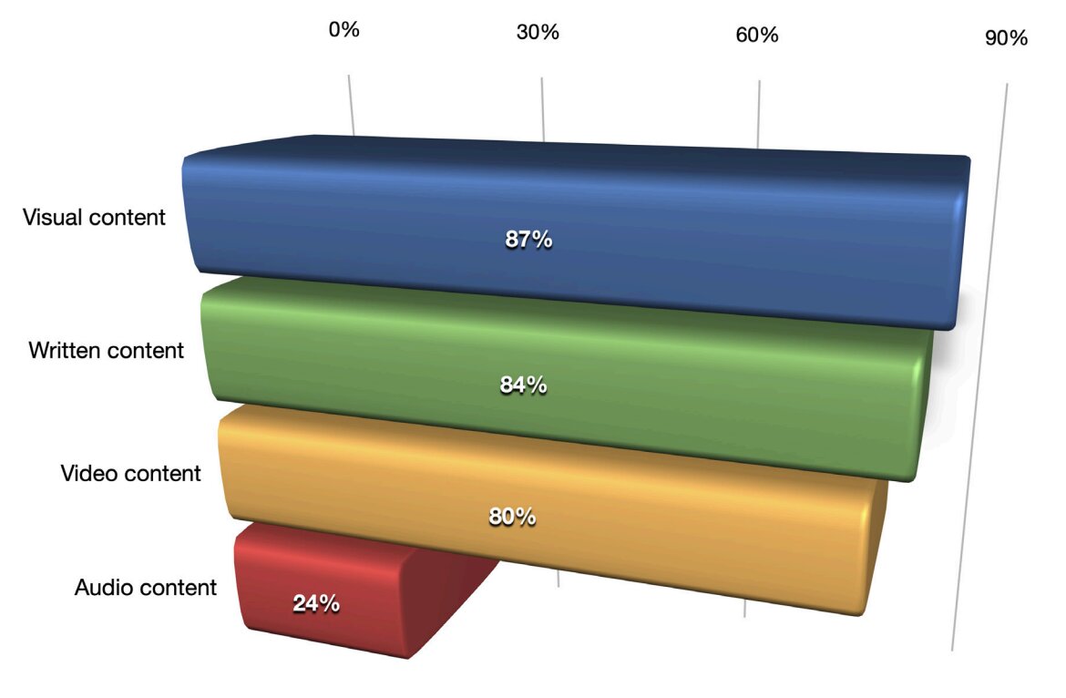 Los formatos preferidos por profesionales del marketing actualmente en redes sociales son, en orden: contenido en gráfico, escrito y en video. Esto es porque claramente, crear videos no es tan sencillo, pero es importante notar que de cualquier forma, las 3 categorías están muy cerradas.