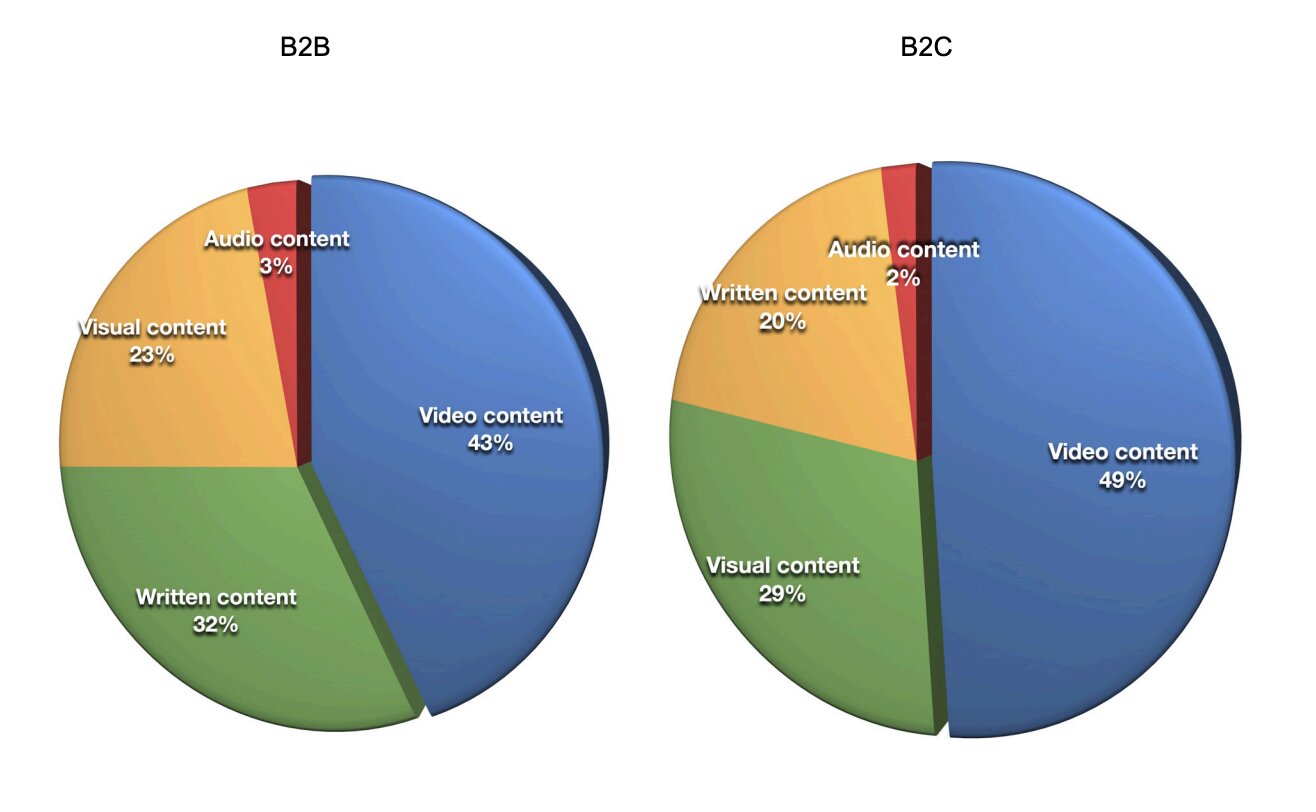 Si bien el contenido más importante para profesionales del marketing es el video, el segundo lugar se lo lleva el gráfico en el caso B2C y el escrito en el caso B2B, y esto es lógico porque en B2B es muy relevante mostrar expertise, y esto se logra bien con el contenido escrito en Linkedin.