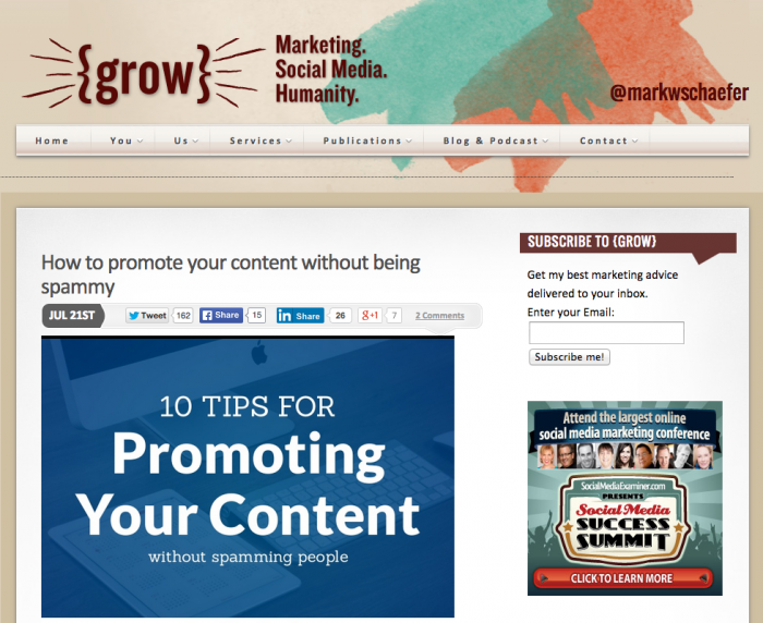 Mark Schaefer es la fuerza detrás del increíble blog «Grow«. Él utiliza su blog como puerta de entrada para su consultoría, asesoramiento y formación empresarial ayudando a las empresas a crecer aprovechando el poder del marketing de los medios sociales.
