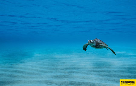 Sin mucho factor persuasivo pero enclavado en el entorno natural del producto, llega este anuncio de trajes de baño Wonderbra que cambia sus dos típicas razones 38B que usualmente expone, por una tortuga en el fondo del mar que se ve gratamente sorprendida al encontrarse aquello que nosotros no vemos.