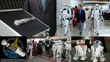 Roger Bornstein, director de marketing de la NASA recibió de manos de Chewbacca el sable laser original que utilizara Luke Skywalker en El Regreso del Jedi; después tomó un avión y se trasladó de California a Texas, donde fue escoltado por R2-D2, Darth Vader, y un contingente de Stormtroopers.