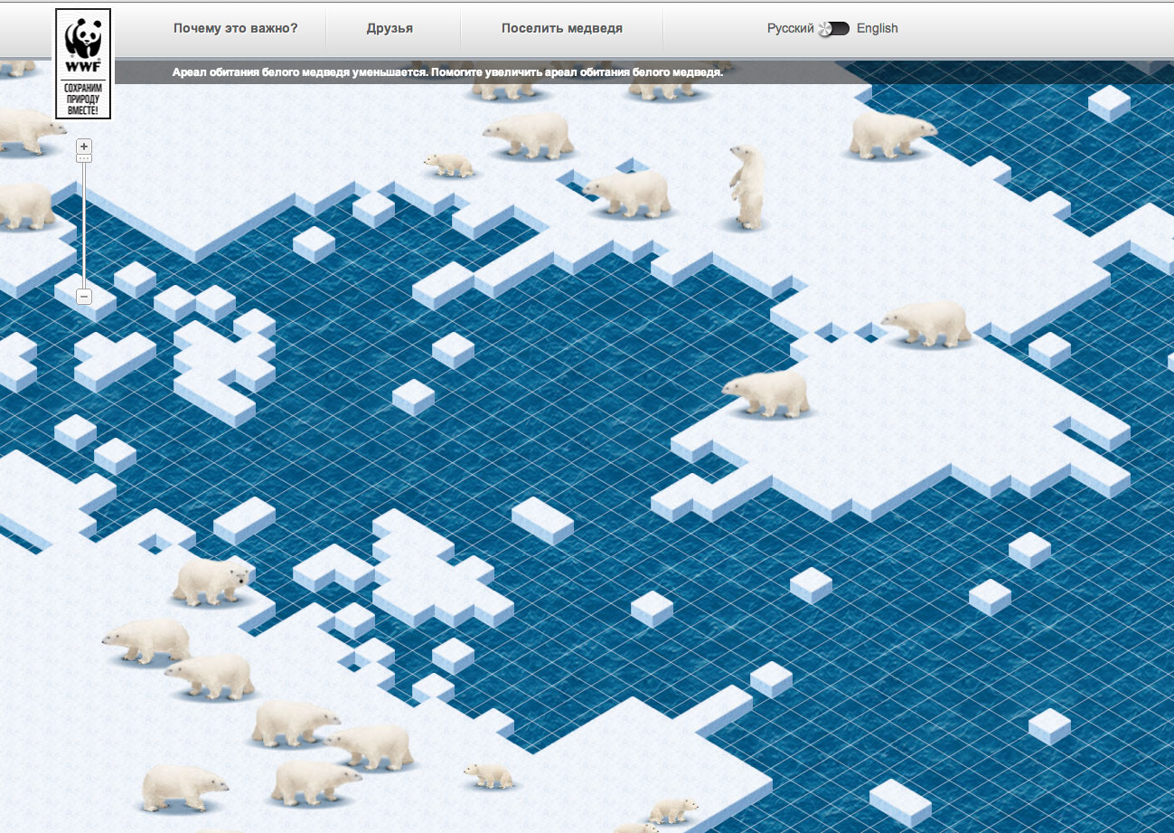 Para generar conciencia de la problemática, WWF (vía BBDO Moscow) desarrolló este juego online donde el objetivo es agregar hielo a fin de que los osos tengan más espacio para moverse, sin embargo, cada área que queramos añadir, debe antes ser compartida en redes sociales; asimismo se pueden agregar osos, y para ello se solicita loggearse directamente con Facebook o Twitter, de modo que tiene todo el potencial para volverse viral.