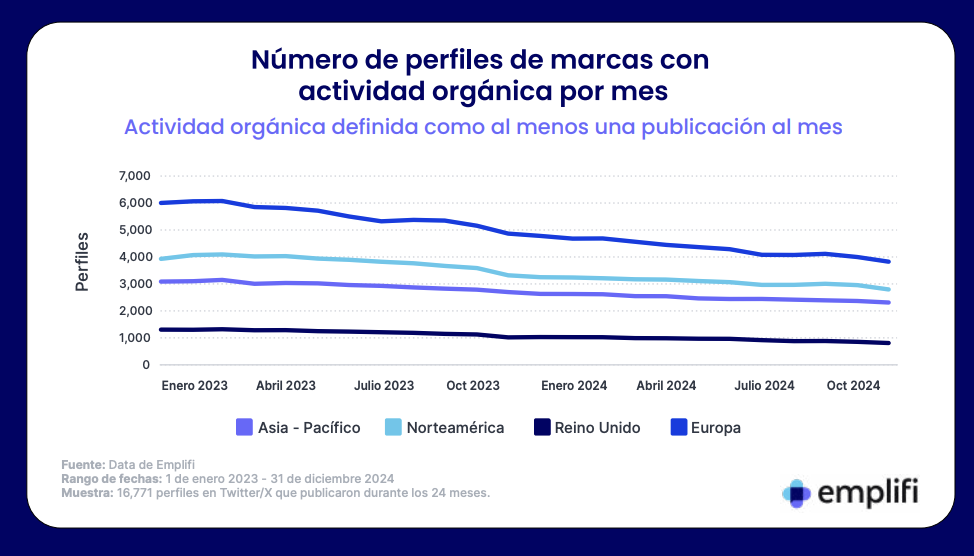 • En 2024, se observó una disminución en la actividad de las marcas en X, con descensos en los perfiles activos, el gasto publicitario y el engagement general.