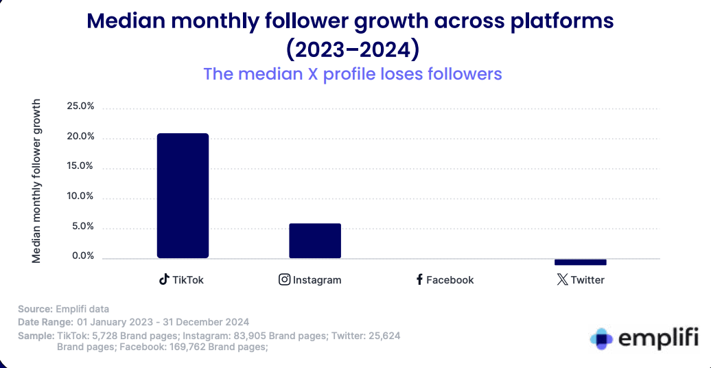 • TikTok lideró el crecimiento con un aumento medio mensual de seguidores del 21% en 2024, especialmente entre las marcas pequeñas y medianas. Esto subraya su atractivo para audiencias más jóvenes.