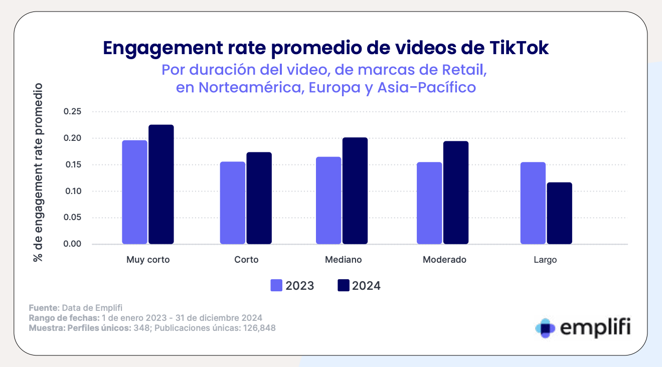 • El engagement en TikTok creció para las cuentas extra pequeñas (<10,000 seguidores) en todos los sectores analizados en 2024.