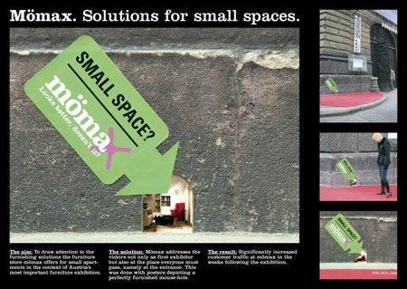 Muebles para departamentos pequeños. Este es el negocio de Mí¶max en Austria. Para publicitarlo en la expo más importante de mobiliario en su país, se desarrolló esta interesante guerrilla que además mantiene un toque de humor, lo que siempre es una buena herramienta para con el consumidor.