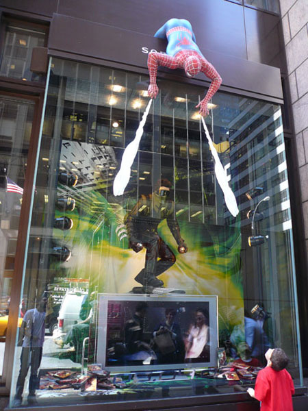 Aprovechando este entorno, la tienda Sony apabulló a los neoyorquinos con estos outdoors-guerrilla colocados en su fachada. (Columbia Pictures Industries, Inc. productora de Spider-Man 3 forma parte de Columbia TriStar Motion Picture Group posesión de Sony Pictures Entertainment, la cual a la vez forma parte del gigante japonés en electrónica Sony.)