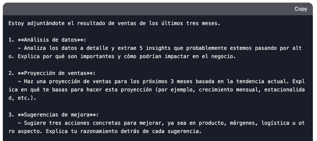 Un verdadero Chain of Thought, debe pedirle a la IA que explique su proceso de pensamiento en cada paso. Esto limita errores por parte de la IA y ayuda a comprender por qué está entregando ese resultado.