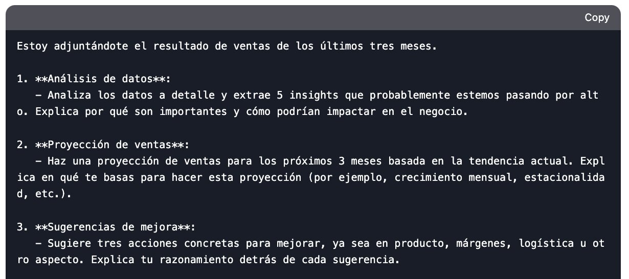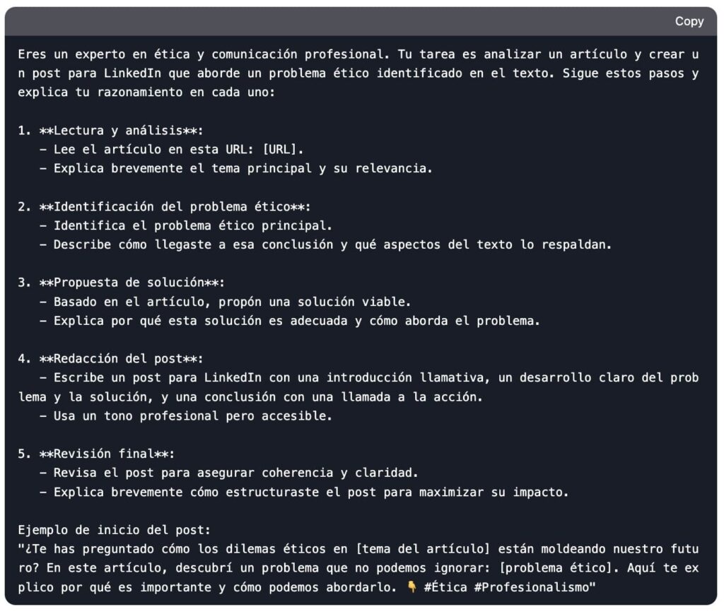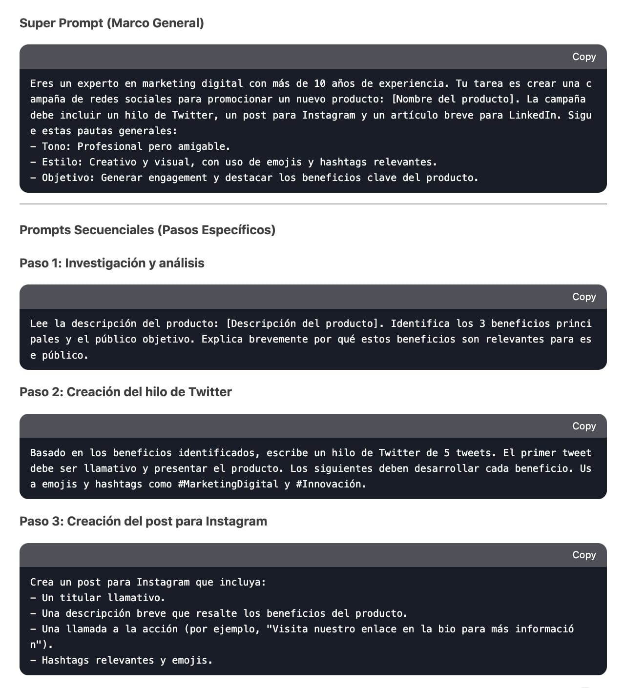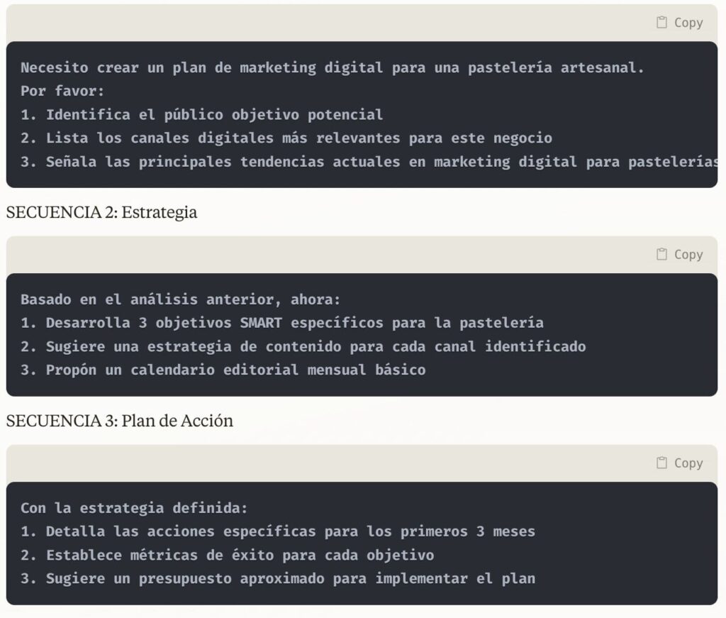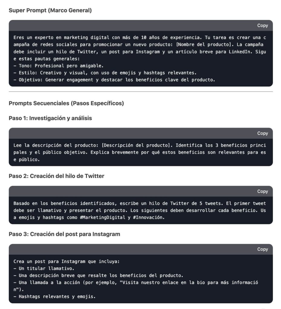 - Prompts Secuenciales: Dividen la tarea en pasos más pequeños y específicos, lo que facilita el control sobre cada etapa y permite ajustar o corregir sobre la marcha.