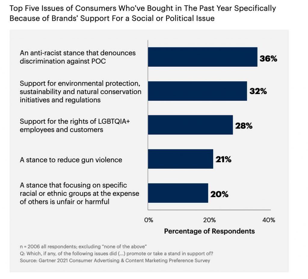 De hecho, Gartner, en su reciente estudio sobre Publicidad y Marketing de Contenidos, apunta a que en 2021, uno de cada 5 consumidores ha efectuado compras a una marca por su postura ante temas sociales, incluyendo… diversidad, inclusión, equidad, lucha anti racismo, apoyo a minorías, etc.