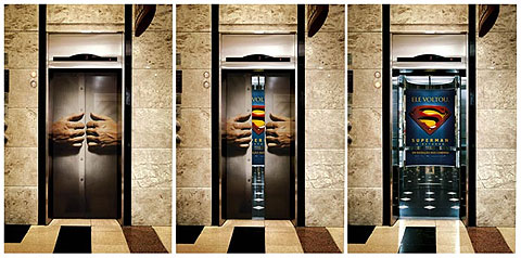 Es moda indiscutiblemente buscar lugares novedosos y sorpresivos para colocar publicidad. Los elevadores no son la excepción. Habí­amos ya visto el caso de Kill Bill y ahora lo hacemos con el Hombre de Acero. Super publicidad para la pelí­cula.