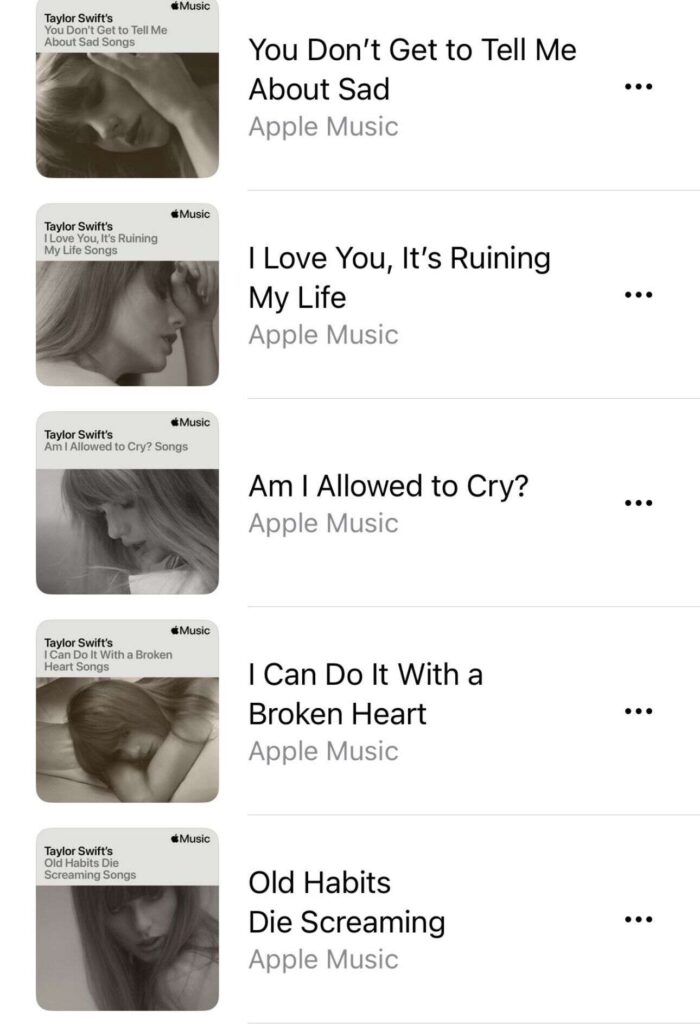 Cada una de estas listas la nombró usando frases del nuevo álbum. Como puedes observar, las cinco listas creadas y sus títulos respetan la quintaesencia del duelo.