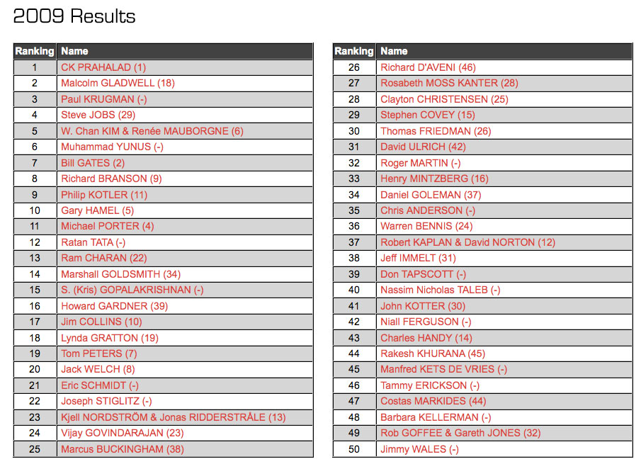 rankingThe Thinkers 50 es una lista bienal de los pensadores más influyentes del mundo de los negocios, elaborada a convocatoria de The Times, de Londres. La elección se hace mediante voto online bajo criterios como originalidad de las ideas, impacto, estilo en sus presentaciones, criterio y sentido de los negocios; después se hace una búsqueda en Google para establecer el número de referencias web a cada uno, constituyéndose esto como un factor más en el ranking.