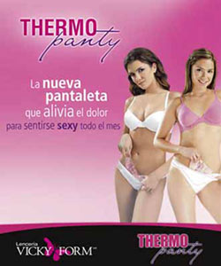 Hoy, las empresas Vicky Form yThermo-Gel (estos últimos, responsables de los jocosos espectaculares de PINCHE MADRAZO y ADIÓS MADRAZO), han llevado la misma idea a un mercado virgen: el beneficio para la mujer en sus «días difíciles. El producto: Thermo Panty.