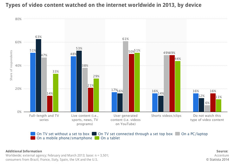 Además de lo anterior, en la siguiente gráfica puedes ver el contenido en video más consumido en el mundo en 2013. Mira cómo el contenido generado por usuario y distribuido a través de YouTube, compite directamente con el contenido televisivo [tti link=» Twittea esto»]El contenido generado por usuario y distribuido a través de YouTube compite ya con el televisivo[/tti]; y además mira los videos cortos ¡Impresionante! ¿Qué esperas para comenzar a aprovechar esto para tu marca? ¿Te acuerdas que hace unos días hablábamos también de la 2a pantalla? ¿cuántas veces estás mirando TV y además, videos en tu tableta o smartphone?