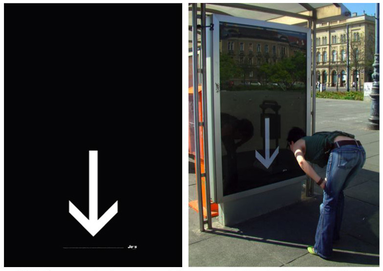 El anuncio, colocado en mobiliario urbano, se desarrolló para Je*s Jeans Stores, quienes obviamente comercializan pantalones de mezclilla. El diseño fue muy sencillo pero ingenioso: una flecha gigante con un texto hasta abajo que obligaba a la gente a agacharse para leerlo; (la curiosidad mató al gato) el copy lee así: En este momento, tu trasero está completamente expuesto. Si trajeras unos jeans sexys, llamaría la atención todo el tiempo.