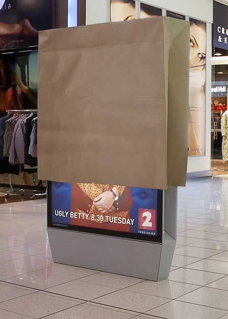Paralelo a ello, es agradable ver que la publicidad para dicho producto busca la innovación. Esto es, en contraposición con la protagonista, verdaderamente una belleza: se trata de una guerrilla en la que simplemente a los mobiliarios publicitarios que ostentaban anuncios de Ugly Betty, se les colocó una bolsa cubriéndolos, obviamente en clara referencia a la fealdad.