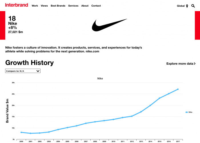 Hoy, es una de las 20 marcas más valiosas del mundo. Mira la gráfica del crecimiento de su valor desde la publicación de NO LOGO en 2000 a 2017.