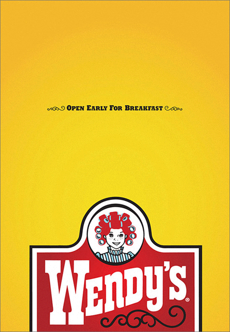 Un diseño extraordinario para la cadena de hamburguesas Wendy’s. En Estados Unidos, el personaje de estos establecimientos, una pequeña pelirroja con trenzas, es sumamente conocida. Aprovechando esta situación, para publicitar los desayunos, simplemente se retocó el logotipo, haciendo parecer a la niña, cual si acabara de despertarse, con todo y sus tradicionales rulos. El copy lee: Abrimos temprano para el desayuno.