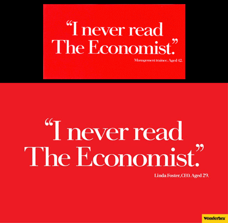 Wonderbra, al ver esta publicidad, publicó una suya con la misma cabeza: Yo nunca leo el Economista, pero la firma es de Linda Foster, ¡CEO a los 29!